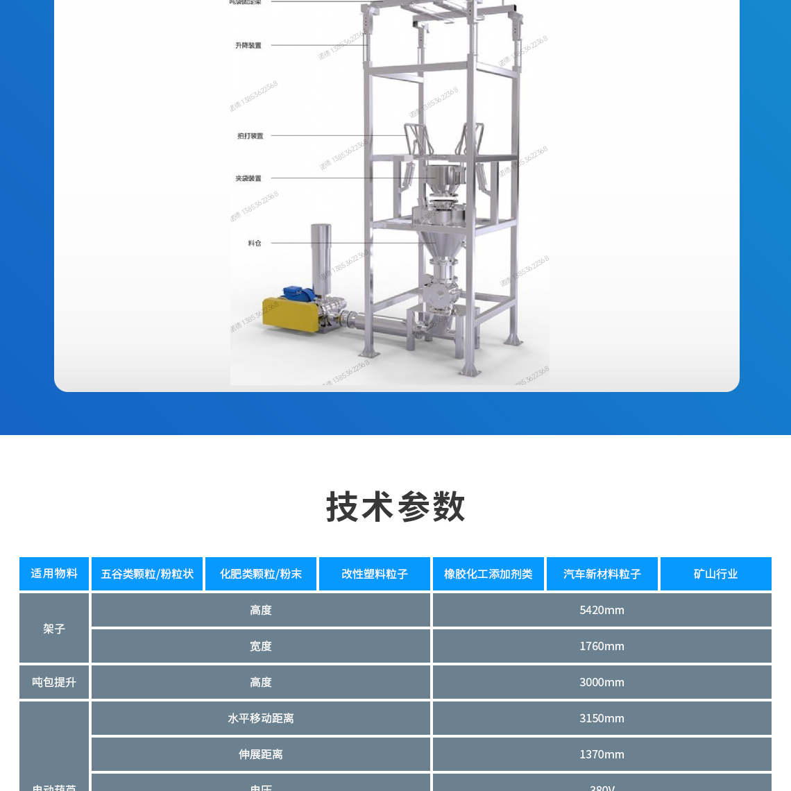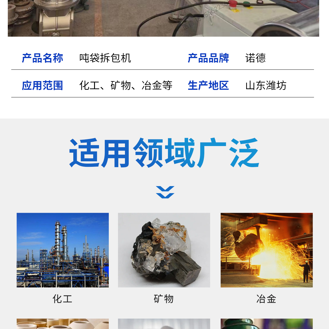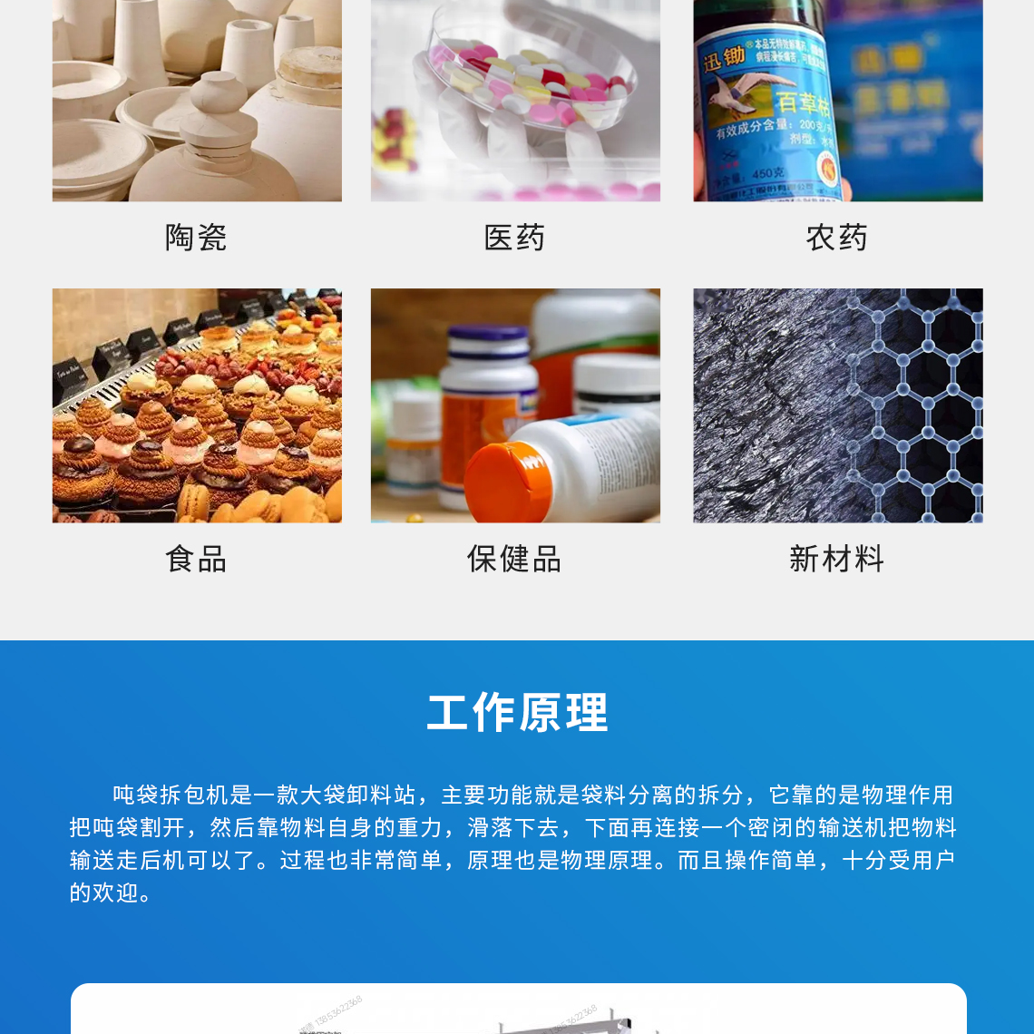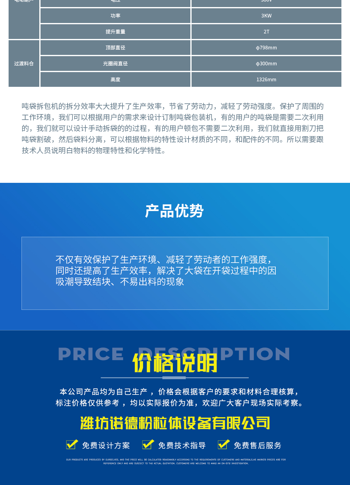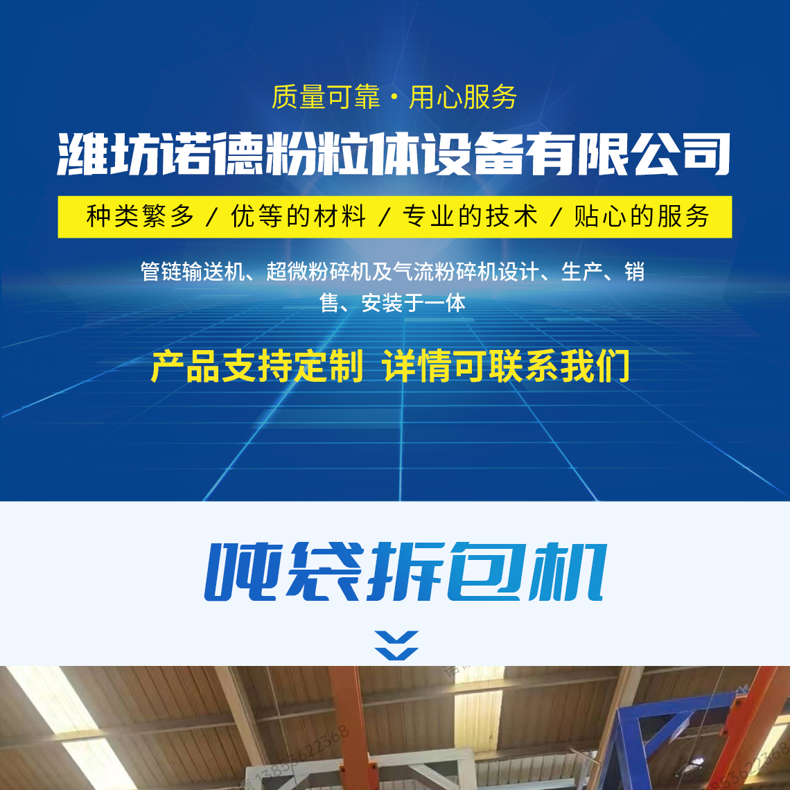 噸袋拆包機(jī)是一款大袋卸料站,主要功能就是袋料分離的拆分,它靠的是物理作用把噸袋割開,然后靠物料自身的重力,滑落下去,下面再連接一個(gè)密閉的輸送機(jī)把物料輸送走后就可以了。