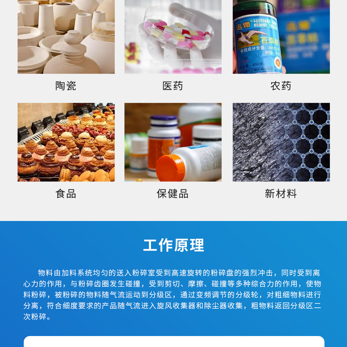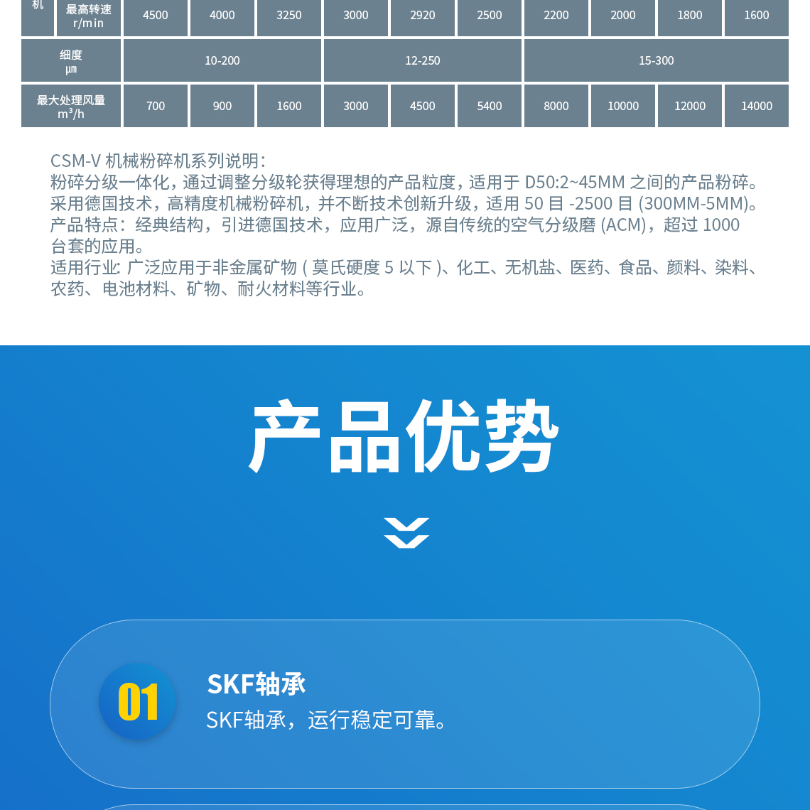 粉碎分級一體化,通過調(diào)整分級輪獲得理想的產(chǎn)品粒度,適用于D50:2~45μm之間的產(chǎn)品粉碎。采用德國技術(shù),高精度機械粉碎機,并不斷技術(shù)創(chuàng)新升級,適用50目-2500目(300μm-5μm)。