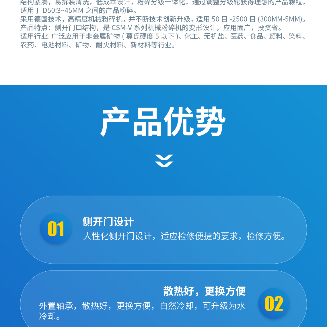 粉碎分級(jí)一體化,通過(guò)調(diào)整分級(jí)輪獲得理想的產(chǎn)品粒度,適用于D50:2~45μm之間的產(chǎn)品粉碎。采用德國(guó)技術(shù),高精度機(jī)械粉碎機(jī),并不斷技術(shù)創(chuàng)新升級(jí),適用50目-2500目(300μm-5μm)。