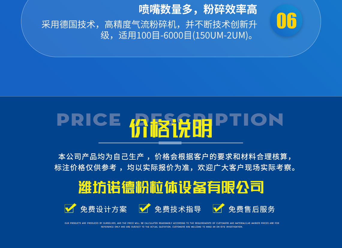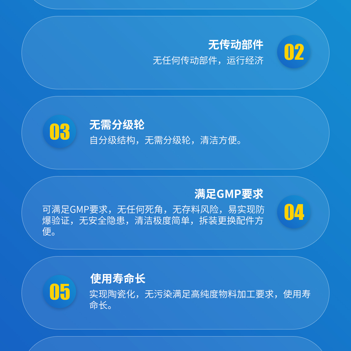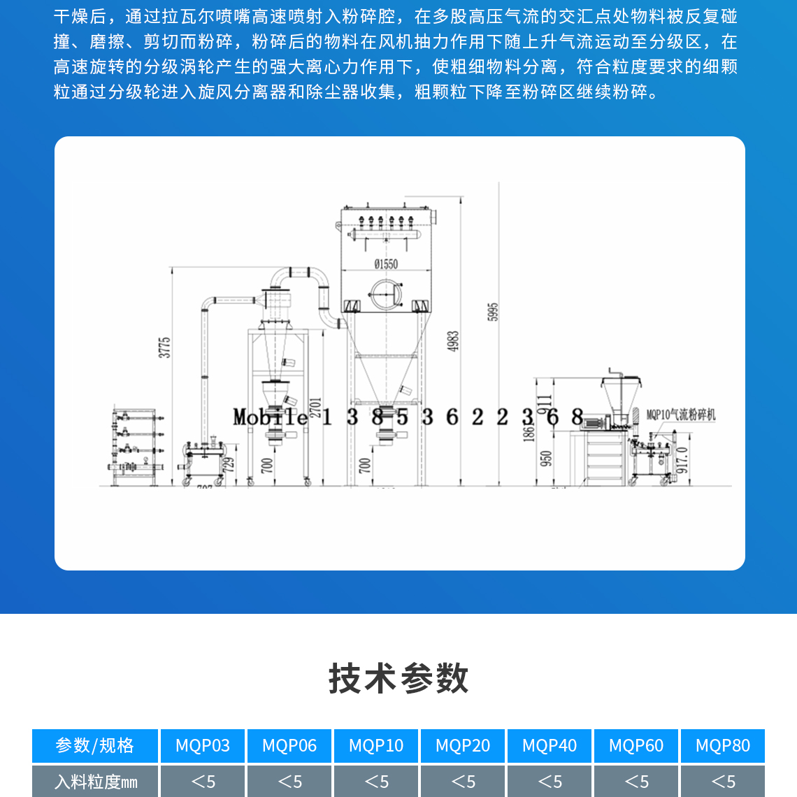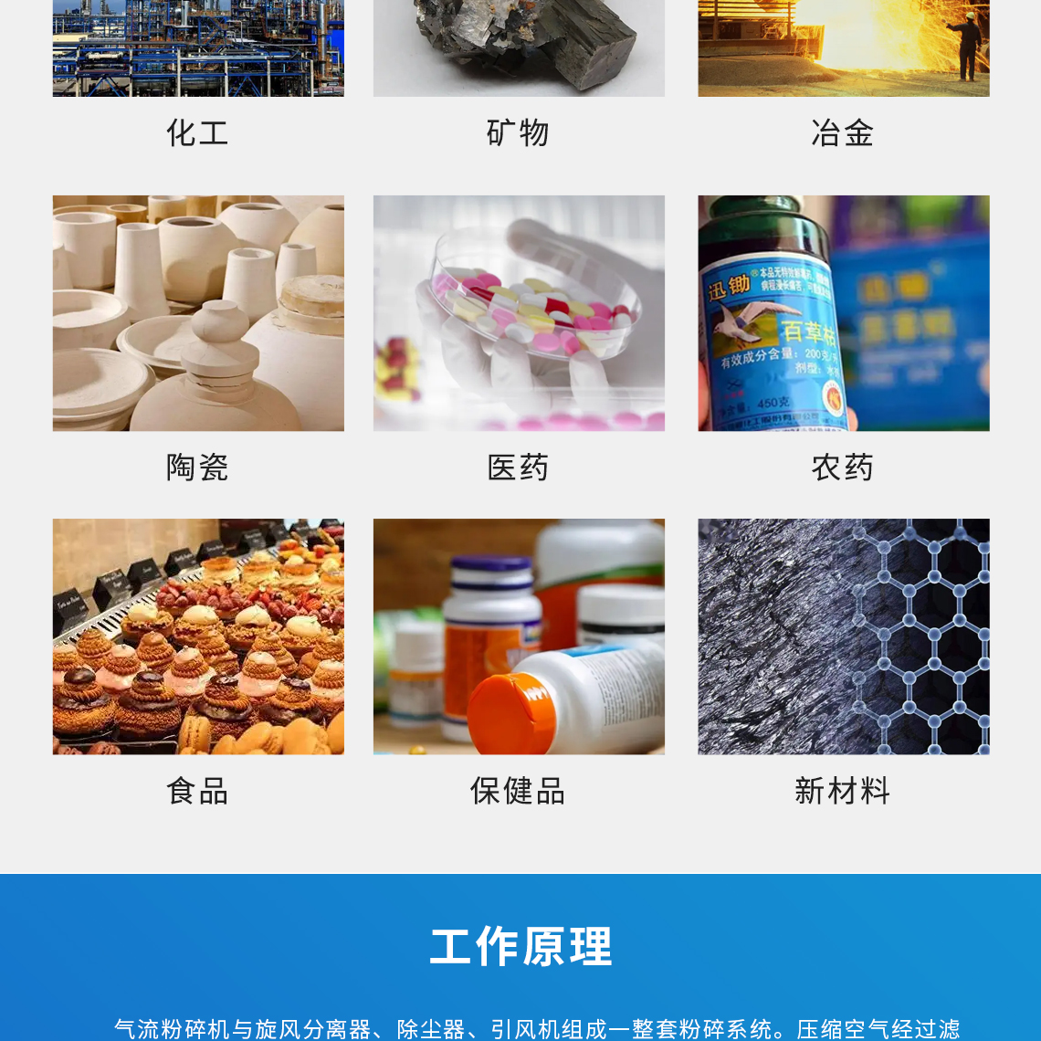 氣流粉碎機(jī)與旋風(fēng)分離器、除塵器、引風(fēng)機(jī)組成一整套粉碎系統(tǒng)。壓縮空氣經(jīng)過濾干燥后,通過拉瓦爾噴嘴高速噴射入粉碎腔,在多股高壓氣流的交匯點(diǎn)處物料被反復(fù)碰撞、磨擦、剪切而粉碎,粉碎后的物料在風(fēng)機(jī)抽力作用下隨上升氣流運(yùn)動(dòng)至分級區(qū),在高速旋轉(zhuǎn)的分級渦輪產(chǎn)生的強(qiáng)大離心力作用下,使粗細(xì)物料分離,符合粒度要求的細(xì)顆粒通過分級輪進(jìn)入旋風(fēng)分離器和除塵器收集,粗顆粒下降至粉碎區(qū)繼續(xù)粉碎。