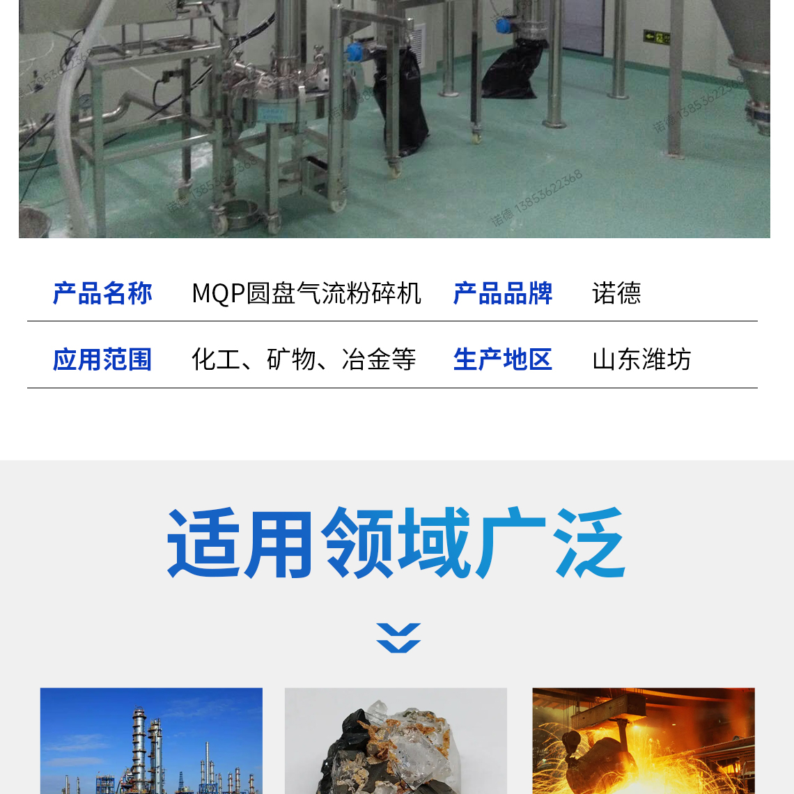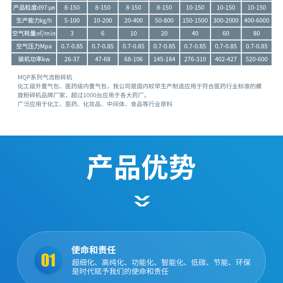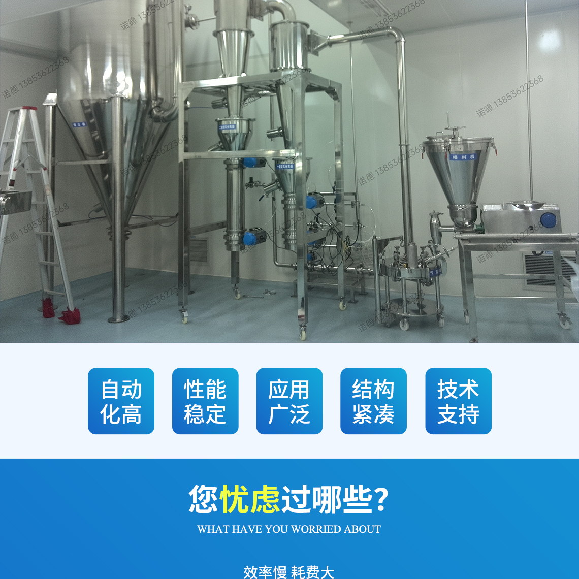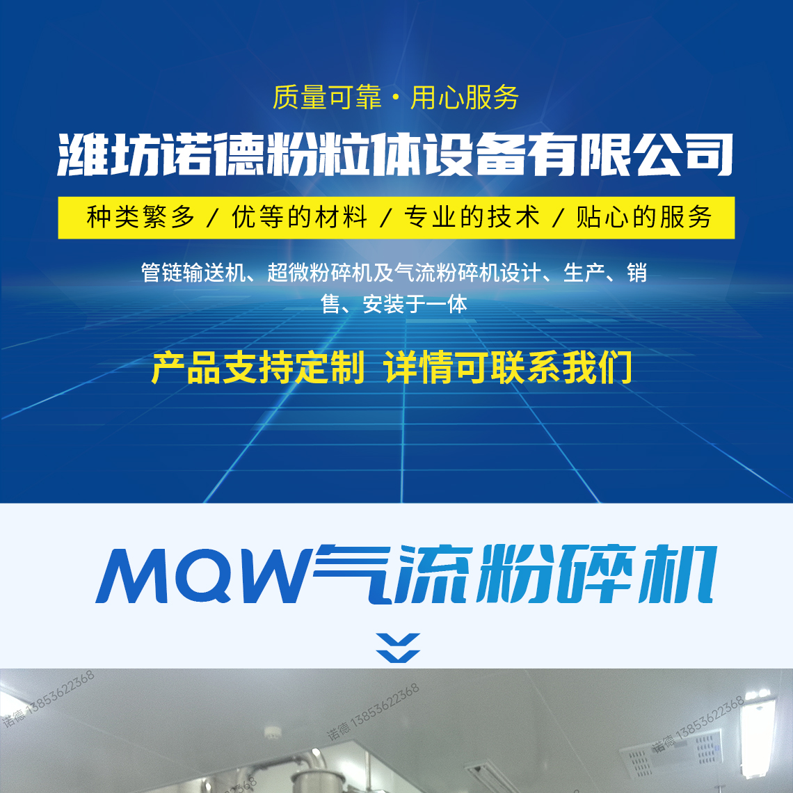 氣流粉碎機(jī)與旋風(fēng)分離器、除塵器、引風(fēng)機(jī)組成一整套粉碎系統(tǒng)。壓縮空氣經(jīng)過濾干燥后,通過拉瓦爾噴嘴高速噴射入粉碎腔,在多股高壓氣流的交匯點(diǎn)處物料被反復(fù)碰撞、磨擦、剪切而粉碎,粉碎后的物料在風(fēng)機(jī)抽力作用下隨上升氣流運(yùn)動(dòng)至分級區(qū),在高速旋轉(zhuǎn)的分級渦輪產(chǎn)生的強(qiáng)大離心力作用下,使粗細(xì)物料分離,符合粒度要求的細(xì)顆粒通過分級輪進(jìn)入旋風(fēng)分離器和除塵器收集,粗顆粒下降至粉碎區(qū)繼續(xù)粉碎。