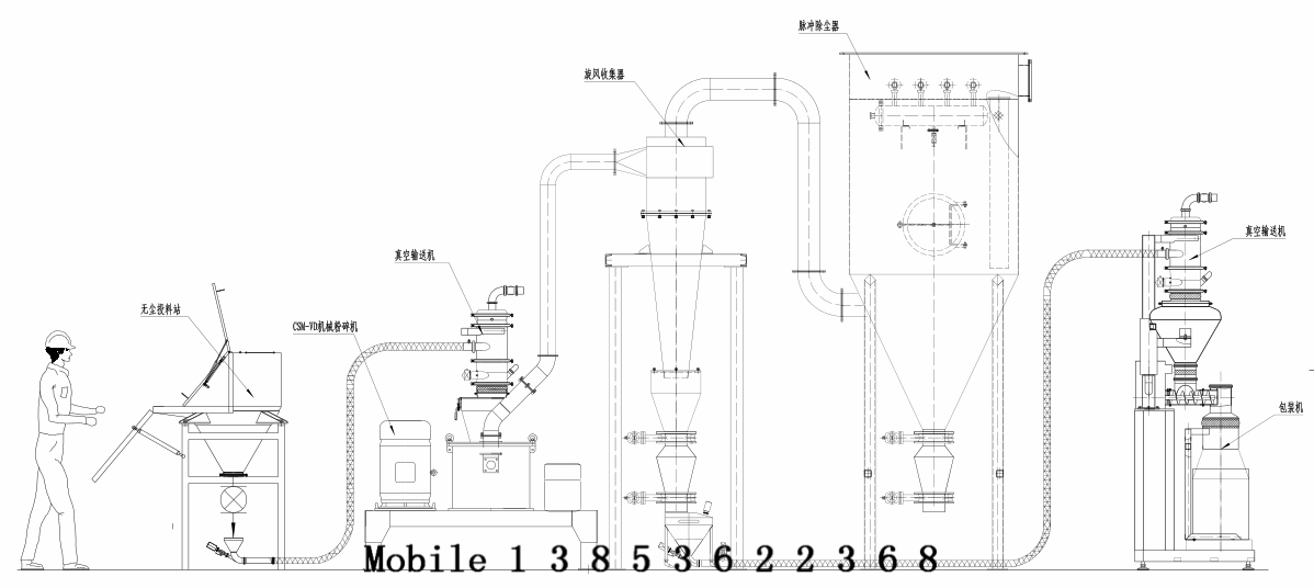 物料由加料系統(tǒng)均勻的送入粉碎室受到高速旋轉(zhuǎn)的粉碎盤的強(qiáng)烈沖擊,同時(shí)受到離心力的作用,與粉碎齒圈發(fā)生碰撞,受到剪切、摩擦、碰撞等多種綜合力的作用,使物料粉碎,被粉碎的物料隨氣流運(yùn)動(dòng)到分級(jí)區(qū),通過變頻調(diào)節(jié)的分級(jí)輪,對(duì)粗細(xì)物料進(jìn)行分離,符合細(xì)度要求的產(chǎn)品隨氣流進(jìn)入旋風(fēng)收集器和除塵器收集,粗物料返回分級(jí)區(qū)二次粉碎。