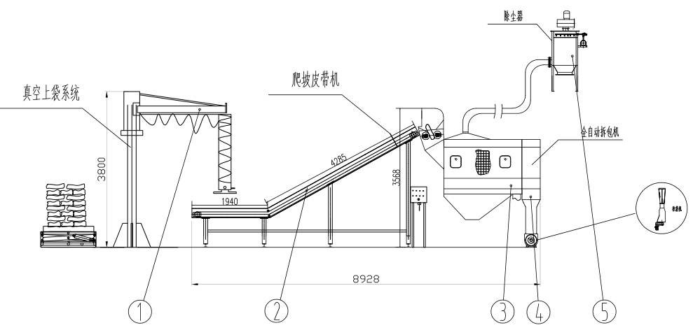 7、破袋、卸料、分離后與其它輸送設(shè)備配套使用可完成粉體輸送儲存等功能。